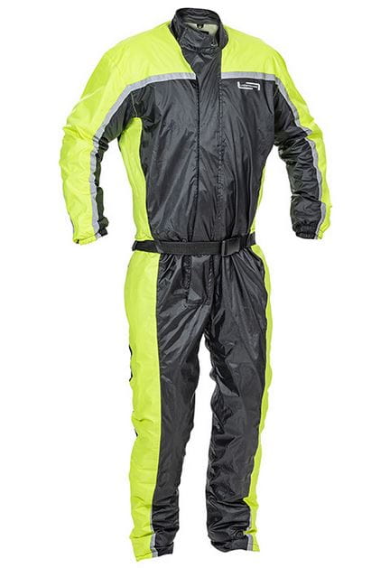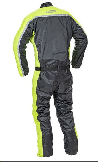 Jednoczęściowy kombinezon przeciwdeszczowy wykonany w 100% z wodoodpornego materiału poliestrowego, przystosowany do noszenia na odzież motocyklową.